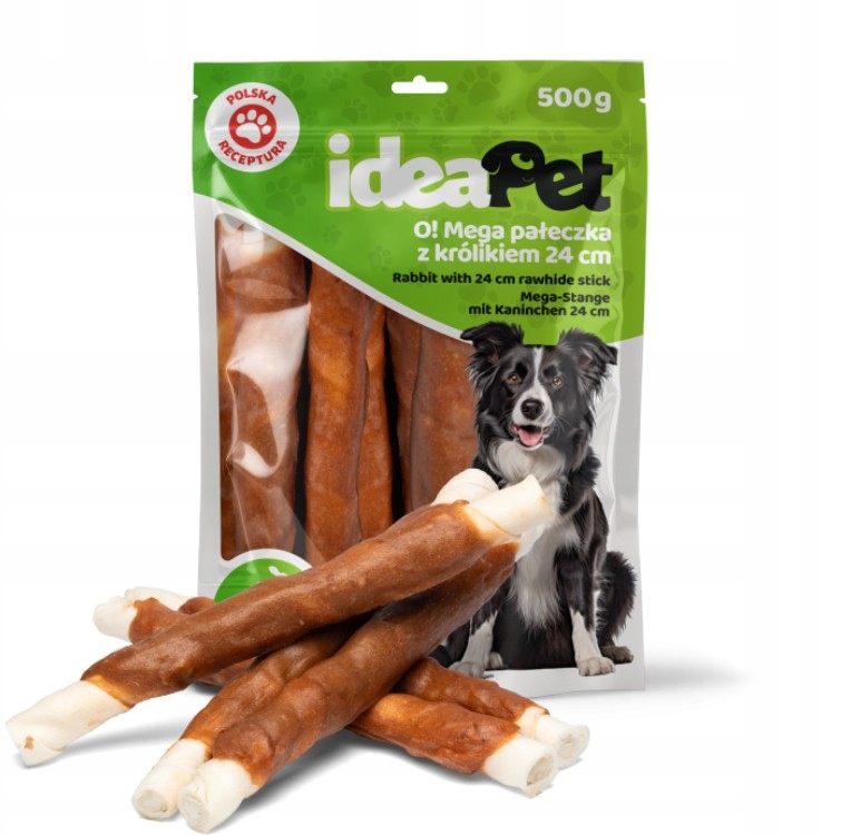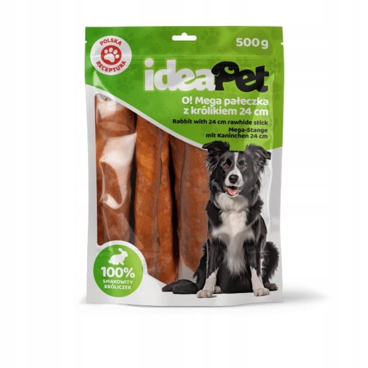 ideaPet Mega pałeczka z królikiem 500g to pyszna i zdrowa przekąska, która sprawi, że Twój pies będzie szczęśliwy i zadowolony. Daj swojemu pupilowi to, co najlepsze, i obserwuj, jak z radością delektuje się każdym kęsem!
