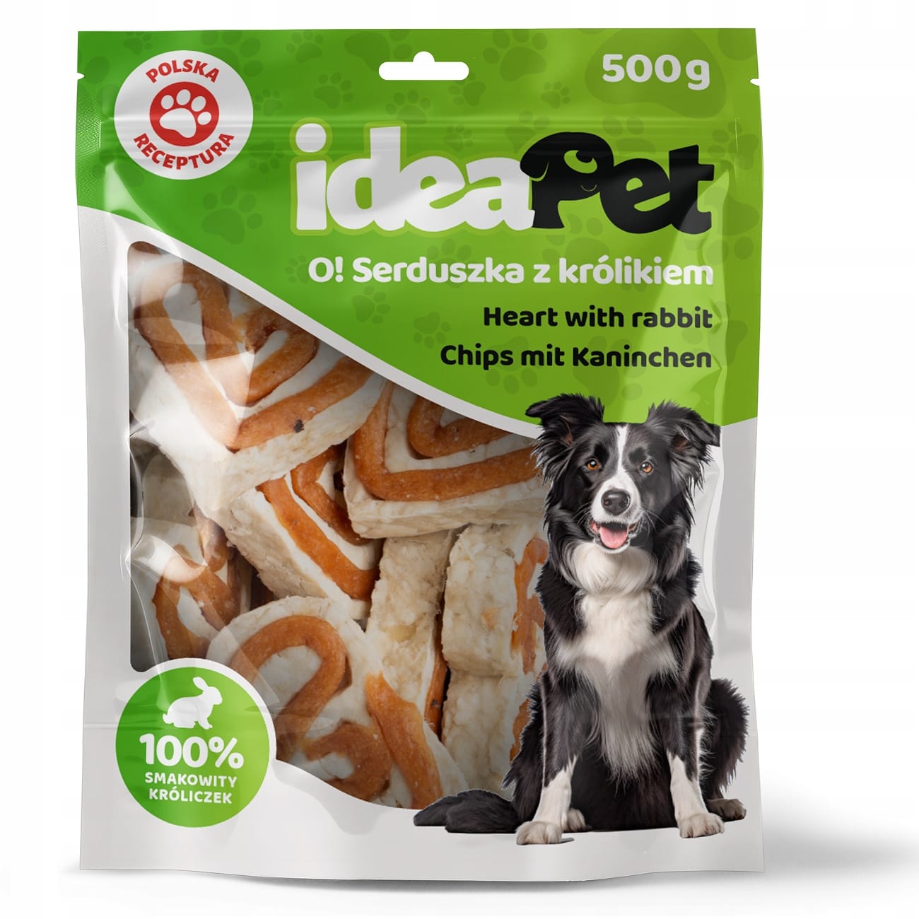 - IdeaPet Serduszka z królikiem to smaczna i zdrowa przekąska w kształcie serduszek, łącząca skórę wołową (55%) i mięso z królika (20%), idealna do żucia