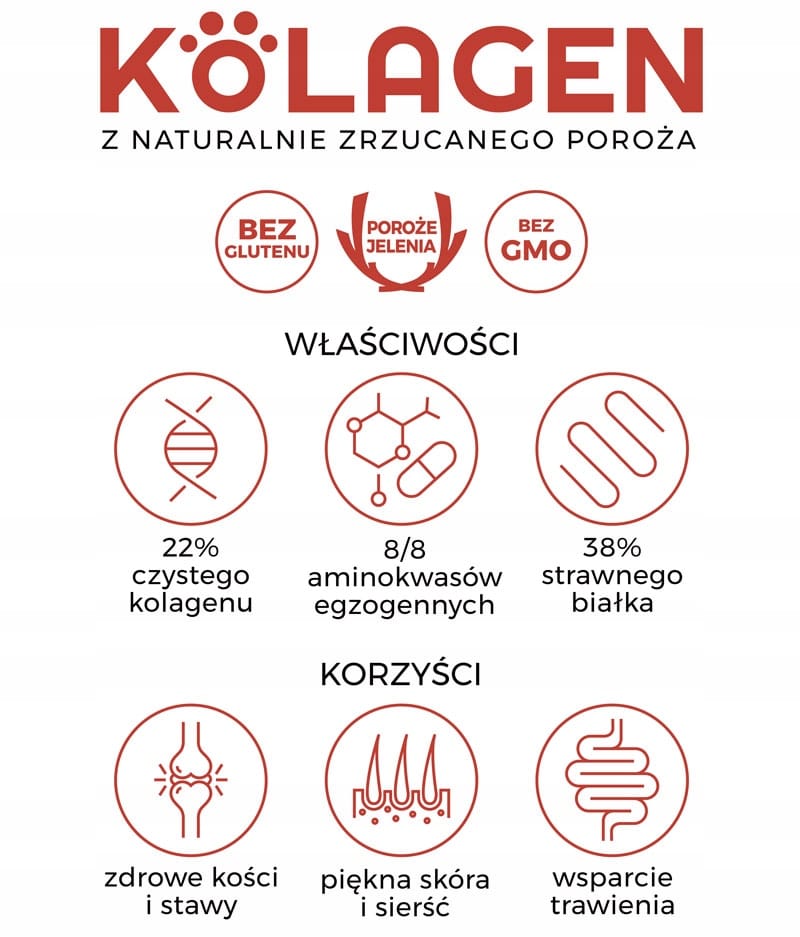 • Zawiera naturalny kolagen z poroża jelenia – wspiera stawy, skórę i sierść