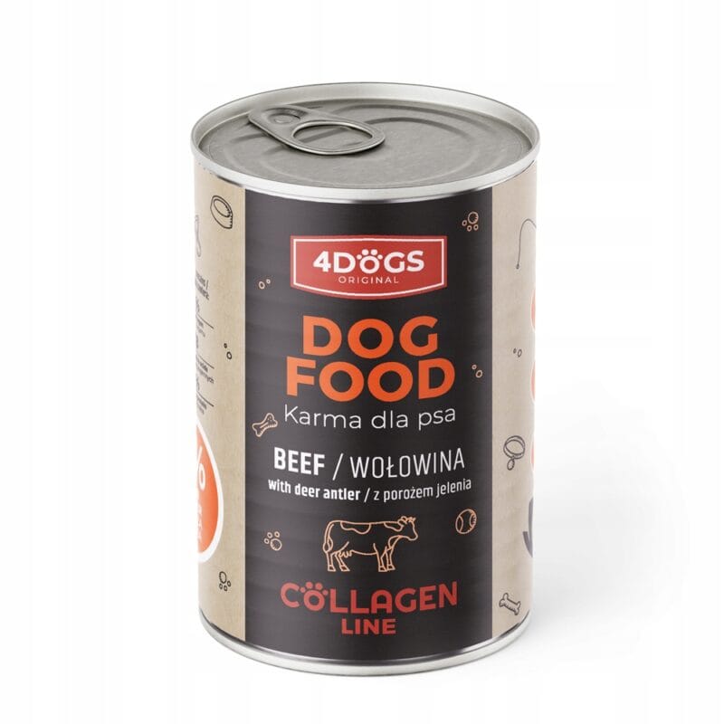 Linia karm 4DOGS Collagen Line to pełnoporcjowe karmy mokre, stworzone z myślą o codziennym żywieniu psów w zgodzie z naturą. Każda puszka to połączenie wysokiej jakości składników, prostego składu i dodatku naturalnego kolagenu, który wspiera stawy, skórę i sierść Twojego psa.
