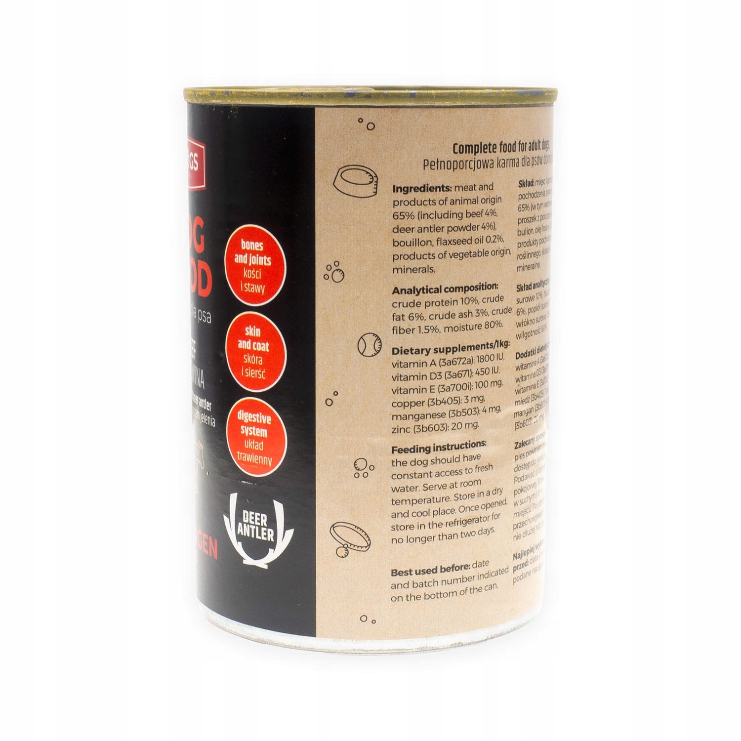 • Skład: mięso i produkty pochodzenia zwierzęcego 65% (w tym wołowina 4%, proszek z poroża jelenia 4%), bulion, olej lniany 0,2%, produkty pochodzenia roślinnego, składniki mineralne.