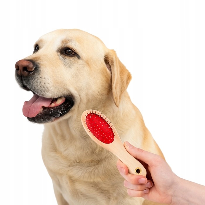 Dwustronna szczotka do pielęgnacji psów i kotów – naturalna, drewniana rączka pewnie leży w dłoni, a dwie funkcje ułatwiają codzienną pielęgnację sierści.